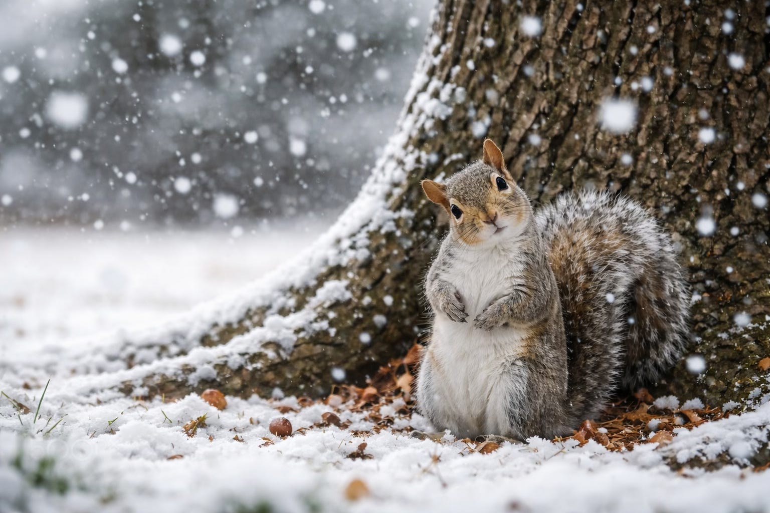 A squirrel, waiting for his morning nut, stood upright beneath the oak tree in my yard.